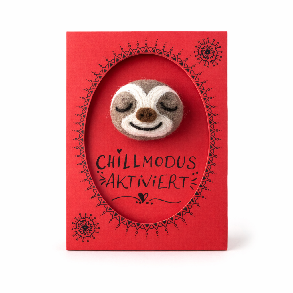 Das handgefilzte Lumi-Faultier steht für Achtsamkeit, Gelassenheit und kleine Ruhepausen im Alltag. Die Karte erinnert daran, den Chillmodus zu aktivieren und sich bewusst einen Moment Zeit für sich zu nehmen.